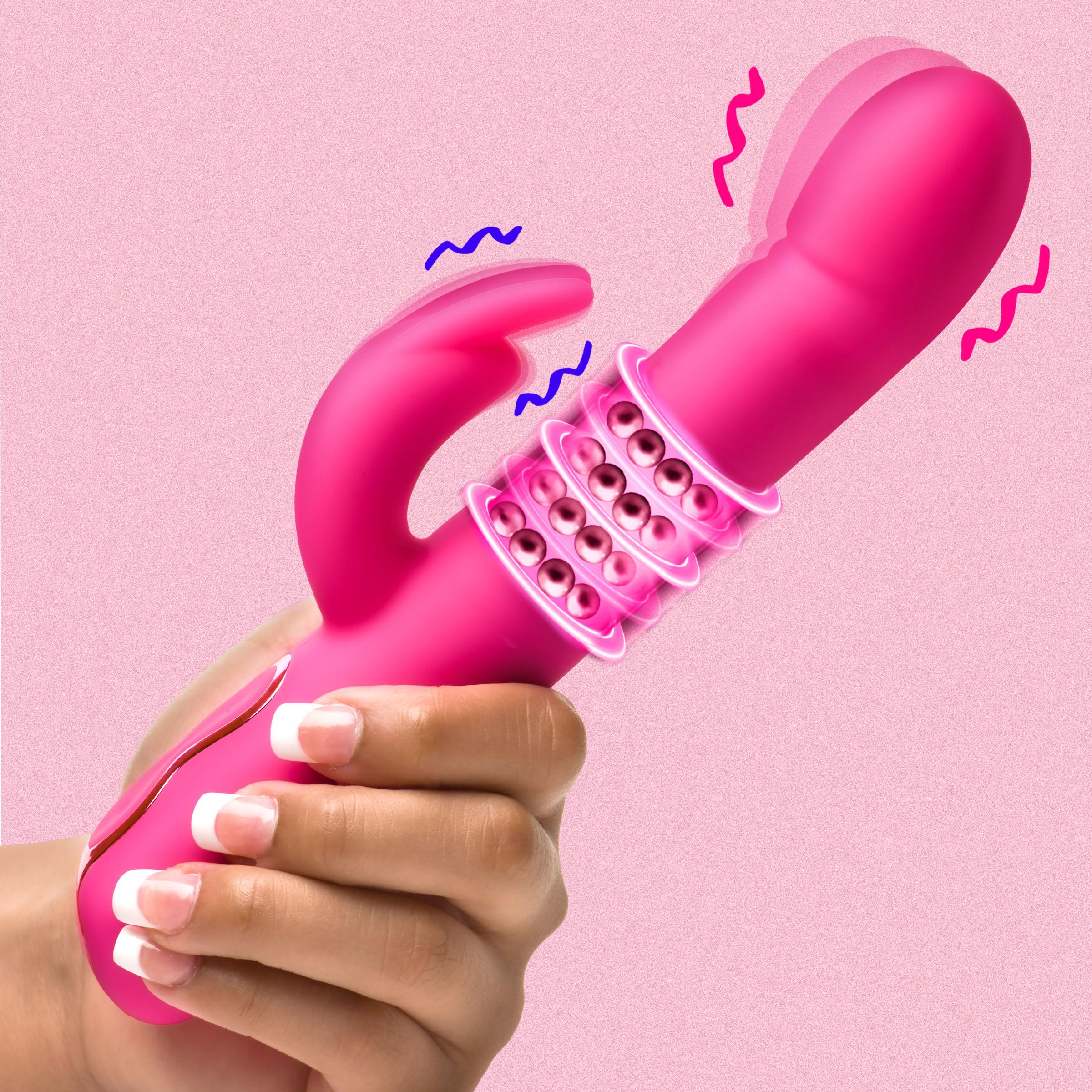 Key Features: Silicone Rabbit Vibe: This silky smooth, premium silicone-covered rabbit vibrator stimulates the clitoris while simultaneously penetrating and pleasuring your G-spot from within! All silicone is phthalate-free and body-safe. Come Hither Head: The round head moves forward and back in a Come Hither motion to massage your G-spot! Powerful Vibes: Enjoy 3 speeds of shaft vibration and Come Hither motion! Beading Ring: A beaded ring slides up and down the shaft beneath the smooth silicone. Triple Motor Rabbit Vibes: Enjoy triple motors that power the clit-stimulating rabbit vibrator! Choose between 3 speeds and 7 patterns. Splashproof and Rechargeable: Rated IPX5, this rabbit vibe is splashproof and should not be taken in the shower or bathtub. Recharge as needed with the USB cable provided.