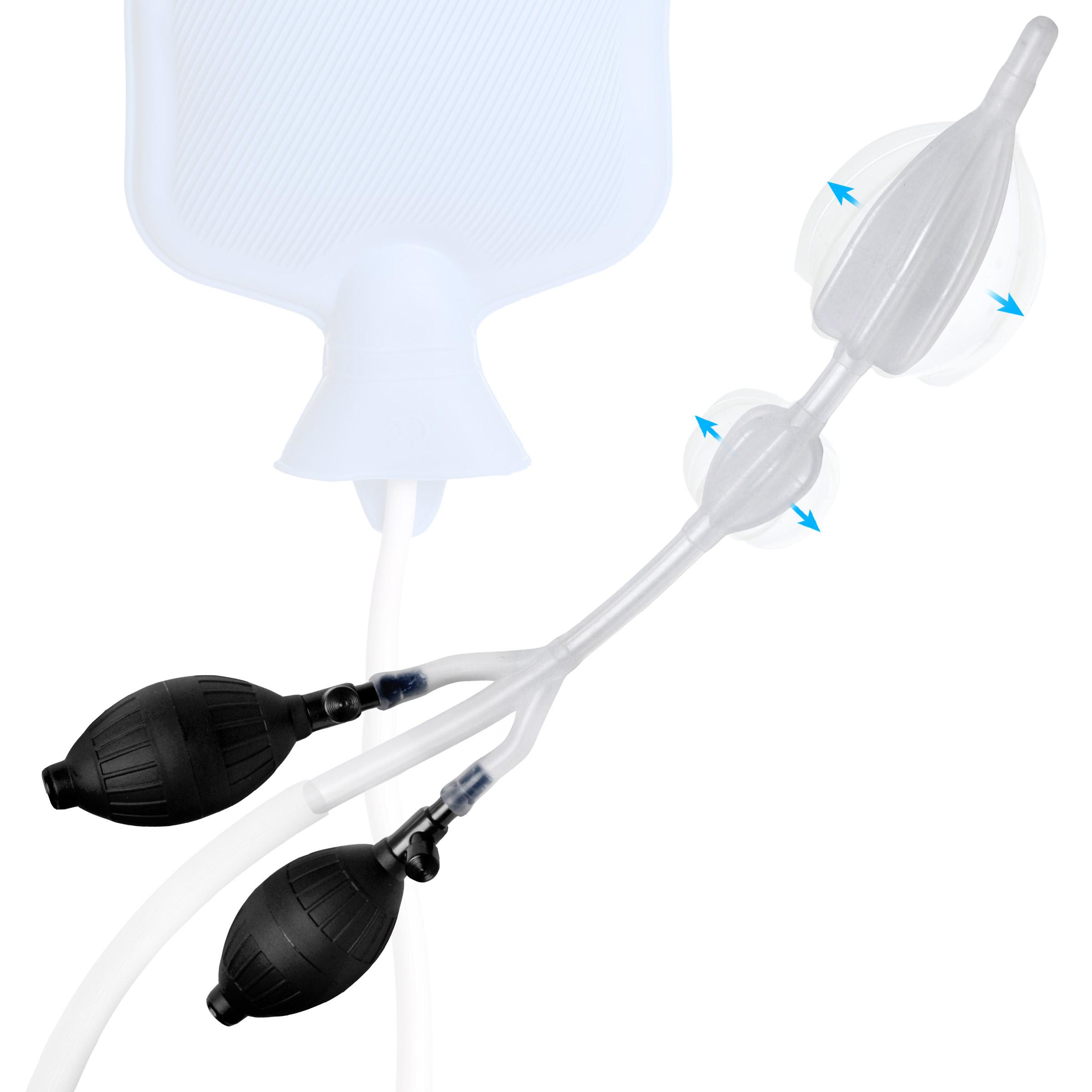 The Silicone Inflatable Double Bulb System is made of premium silicone and is designed for the enema enthusiast. The nozzle is inserted along with the first balloon. Both balloons are then inflated, creating an internal feeling of fullness and an external seal. Once the seal is created, liquid is filled inside of the rectum via a bag system or the Clean Stream In Line Accelerator. The premium silicone is ultra soft yet firm and flexible, for comfortable and body safe use. Each bulb has an integrated release valve for quick deflation and easy removal.