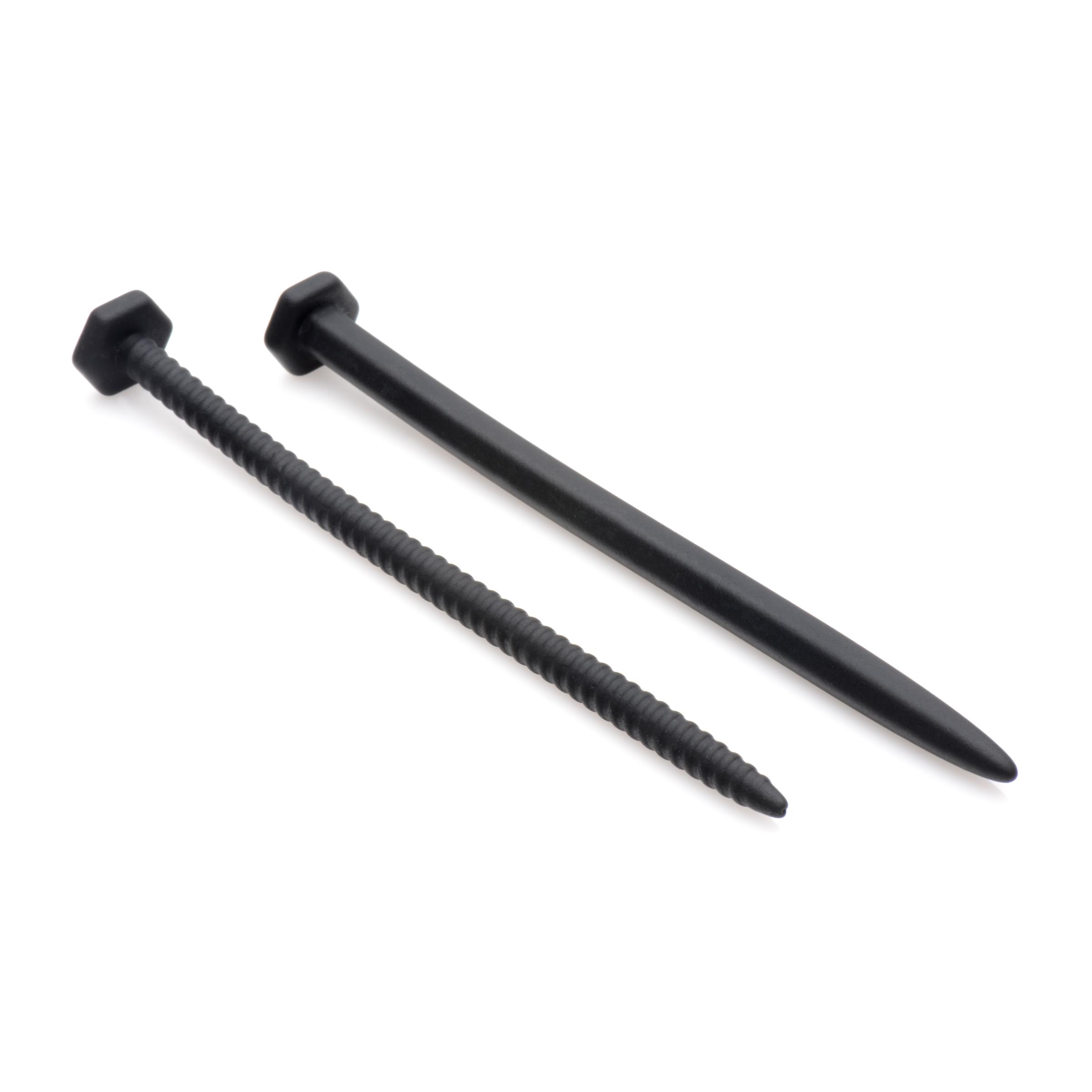 Two irresistible shapes for your penetrative pleasure! Both sounds are shaped like heavy-duty hardware, tempting you with a smooth, hexagonal nail and a spiral-textured screw. The flexibility and silkiness of the material ensures a comfortable insertion as it conforms to your inner curves. Fulfill your most hardcore fantasies with this dastardly duo! Made of premium silicone, these sounding rods are hypoallergenic and easy to clean with mild soap and warm water. Do not use with silicone lubricant.